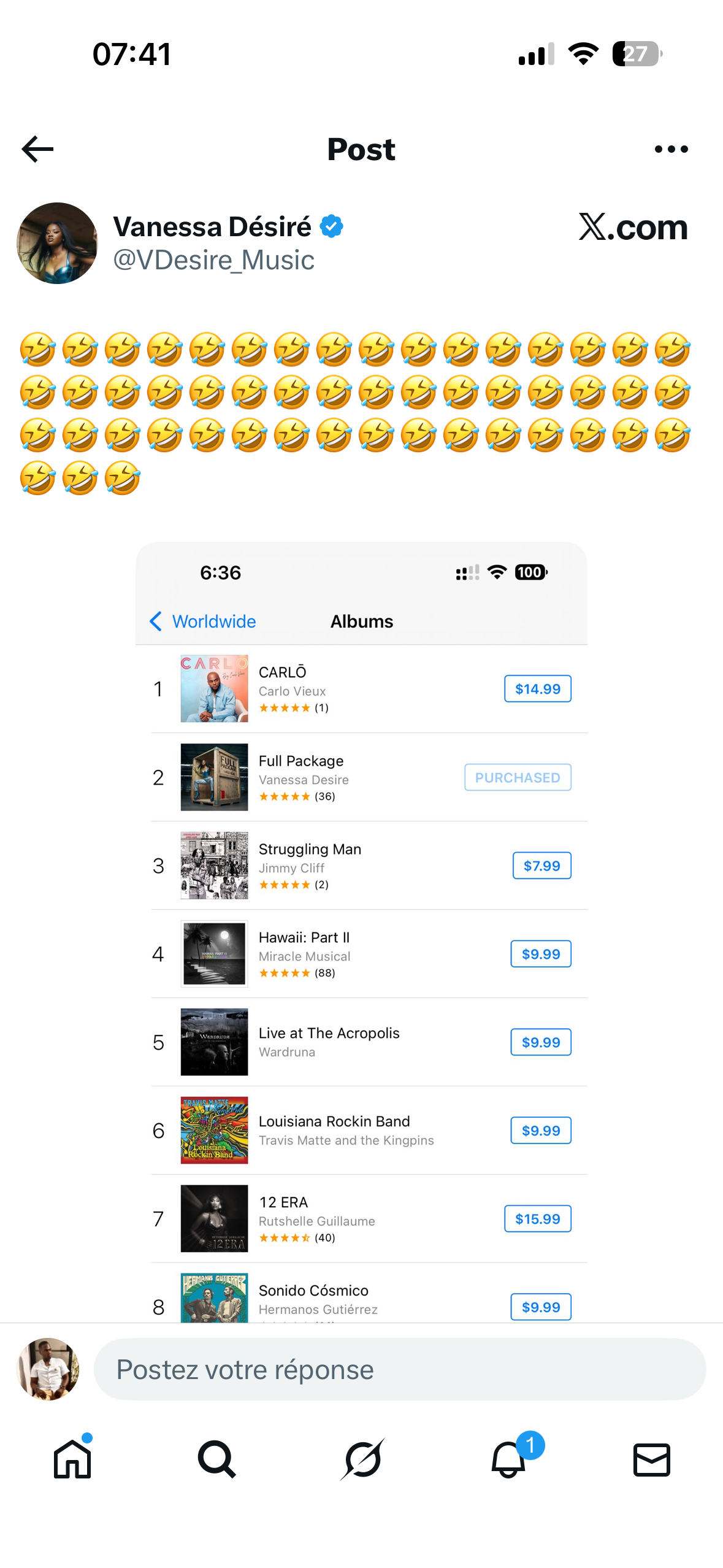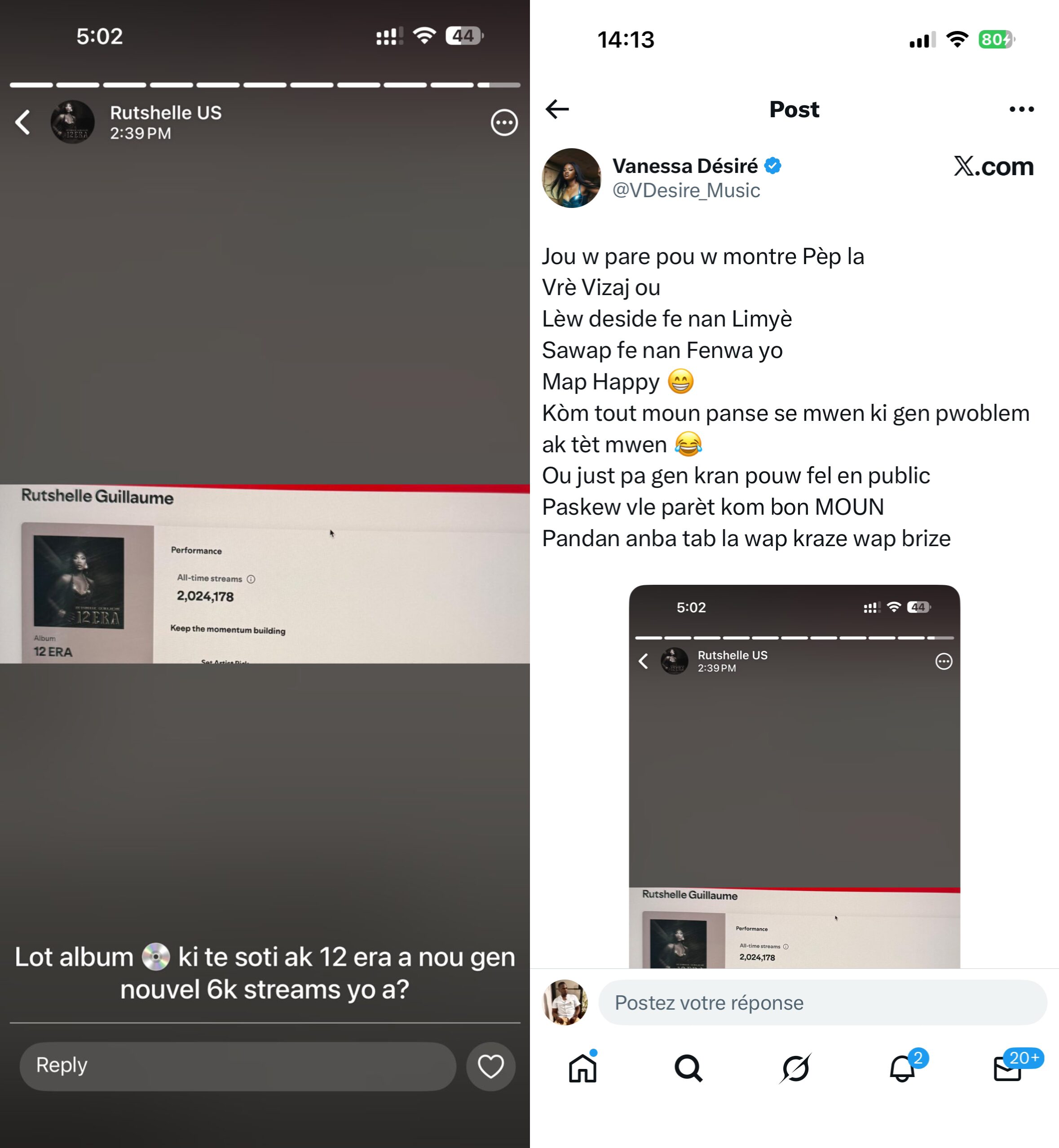 Le 25 novembre, Vanessa Désiré publie une capture d’écran du classement Apple Music, montrant son album Full Package en deuxième position, tandis que “12 Era” de Rutshelle apparaît à la septième place. La publication est accompagnée d’un emoji de petit bonhomme qui pleure de joie, un détail qui n’échappe pas aux internautes et est perçu par beaucoup comme une pique indirecte.